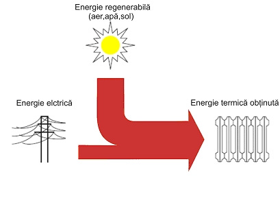 Pompa de caldura obtine aproximativ 80% din energia necesara pentru incalzire din mediul inconjurator, iar pentru restul utilizeaza ca energie de actionare curent electric.