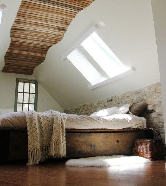 Patul acestui dormitor rustic amenajat in podul casei a fost confectionat din lemn recuperat de la vechea podea a podului.