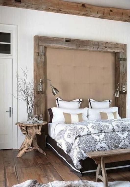 In dormitor, trei grinzi vechi alcatuiesc parca rama unul tablou ce incadreaza tablia patului.