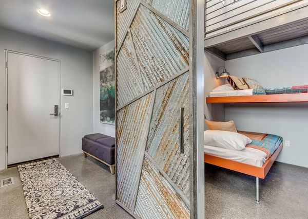 Accesul in incapere se realizeaza printr-o usa culisanta masiva, construita din lemn si tabla refolosita, cu intentia evidenta de a crea inca de la intrare o atmosfera relaxanta de tabara.