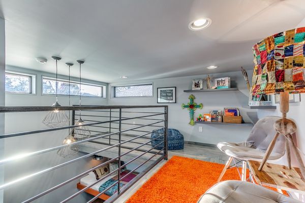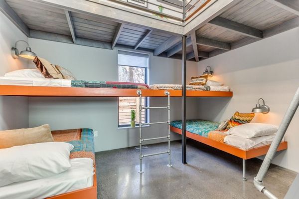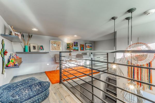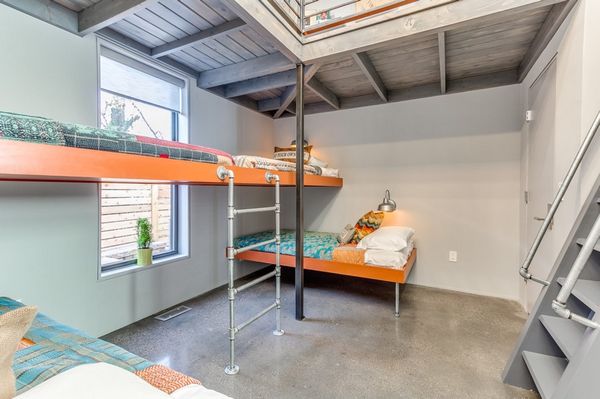 O balustrada metalica ofera siguranta copiilor atunci cand se afla pe platforma. Intreaga amenajare este una modern-minimalista, cu accente industriale.
