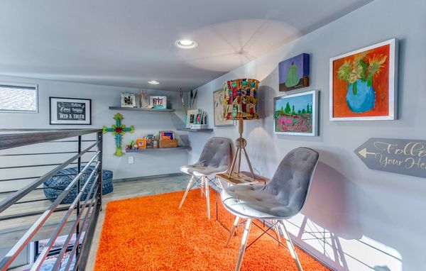 Profitand de inaltimea generoasa a camerei, aproape 4 metri, a fost construita o platforma care adaposteste o zona de lectura, studiu sau joaca, decorata in aceleasi culori vii pe care le regasim si la primul nivel.